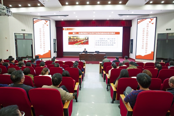 秦剑军首先介绍了党的十九届四中全会召开的现实意义及国内、国际背景,随后,他围绕“充分认识坚持和完善中国特色社会主义制度、推进国家治理体系和治理能力现代化的重大意义”、“深刻领会中国特色社会主义制度和国家治理体系的显著优势,坚定中国特色社会主义制度自信”、“准确把握坚持和完善中国特色社会主义制度、推进国家治理体系和治理能力现代化的总体要求、总体目标和重点任务”、“加强党的领导,确保全会确定的备项目标任务全面落实到位”四个方面系统讲解了全会审议通过的《中共中央关于坚持和完善中国特色社会主义制度、推进国家治理体系和治理能力现代化若干重大问题的决定》,并紧密联系河南发展的成就,解读了中国特色社会主义制度和国家治理体系的显著优势。