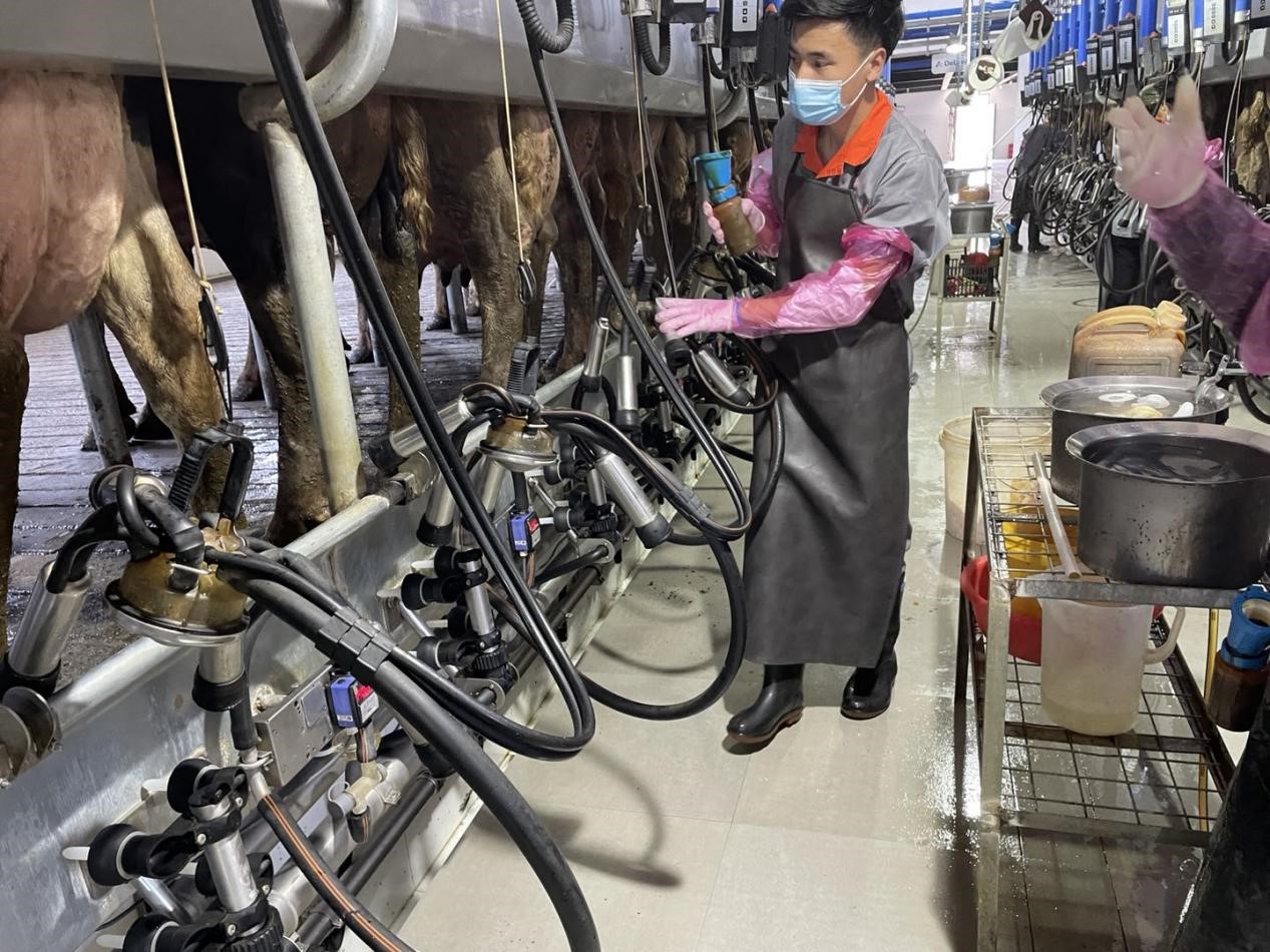 在专业老师的教导下,团队成员开始了一天的工作。实习的主要内容是挤奶厅挤奶,成员们穿上工服和胶鞋,打开挤奶机器开关并配置好消毒液后,就开始了挤奶工作。随着阀门开启便把牛赶进挤奶区,在给奶牛乳头首次消毒后,对每只牛手挤三把奶,观察挤出的奶是否异常,若有异常需要立马单独治疗。挤完后对奶牛乳头进行擦拭并挂杯,奶牛一般有四个乳头对应四个挂杯,压着气压对应乳头就可自动吸附挤奶,若不够四个乳头,装上假奶头正常挂杯即可。挂杯自动拉起代表着奶已经挤完,在成员们完成乳头消毒后,便把牛群赶走准备下一批牛的挤奶工作,在这期间还需完成吸奶器的快速清洗,保证挤奶器的干净。在所有牛都被挤完奶后,成员们进行了最后的大清洗,冲洗整个挤奶厅,清理牛粪等污物,同时打开水奶分离器冲洗挤奶器,等机器停止后对挤奶容器进行热水刷洗,并归回原位。
