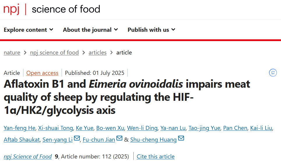 菅复春教授团队在国际权威期刊《npj Science of Food》(中科院一区,影响因子 7.8)在线发表题为 “Aflatoxin B1 and Eimeria ovinoidalis impairs meat quality of sheep by regulating the HIF-1ɑ/HK2/glycolysis axis” 的研究论文。该研究首次系统阐明了黄曲霉毒素 B1(AFB1)与类绵羊艾美耳球虫(E. ovinoidalis)联合作用对羊肉品质的损伤机制,为肉羊养殖中的霉菌毒素防控与球虫病防治提供了全新科学依据。
