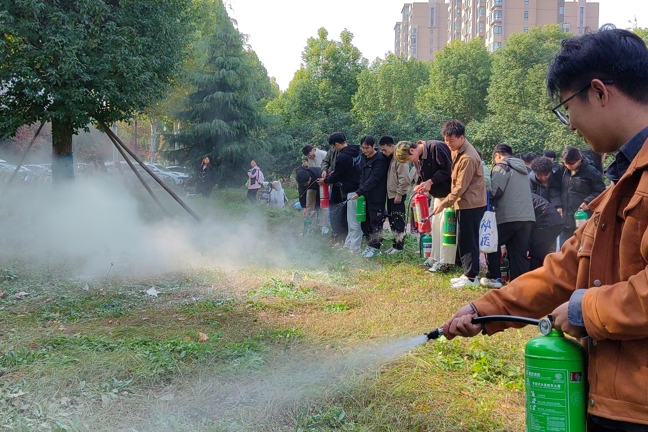 为了使理论知识更加贴近实践,杨东东还带领全体学生到第一实验楼北门前空地处现场演示了灭火器的正确使用方法,包括如何选择合适的灭火器以及如何有效扑灭初期火灾等。在杨东东的指导下,学生们分组进行了灭火器的实际操作练习,每个人都亲自体验了从拔掉保险销到瞄准火源喷射灭火剂的全过程。通过这种手把手的教学方式,有效地提高了学生们在紧急情况下使用消防器材的能力。