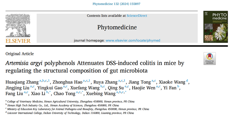 王学兵教授团队在国际知名学术期刊《Phytomedicine》(TOP期刊、中科院一区)上发表了题为“Artemisia argyi polyphenols Attenuates DSS-induced colitis in mice by regulating the structural composition of gut microbiota”的学术论文。该研究深入探索艾草提取物艾草多酚(Artemisia argyi polyphenols,AAPs)对UC小鼠的保护作用机制,以期为进一步研究和开发治疗UC的药物提供新的策略和参考。