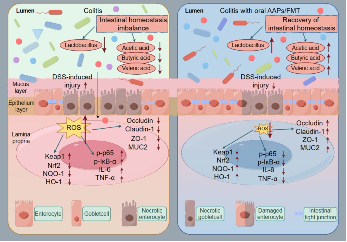 本研究证实口服AAPs可以减轻DSS诱导的小鼠结肠损伤。其机制主要通过改善临床和组织病理学参数,通过调节NF-κB信号通路和Nrf2/HO-1信号通路减轻炎症相关蛋白的表达,增加抗氧化相关蛋白的表达,修复肠道屏障,调节肠道菌群和代谢产物的结构。同时通过粪菌移植试验(Fecal microbiota transplantation,FMT)发现,来自AAPs康复组小鼠的粪便微生物群同样可以通过调节小鼠结肠组织的炎症和氧化应激反应,改善小鼠的结肠屏障损伤,进一步提高小鼠肠道中有益菌Lactobacillus的相对丰度,修复肠道菌群的功能,增加肠道中Acetic acid、Butyric acid和Valeric acid等多种脂肪酸的含量,缓解UC症状。本试验为临床治疗溃疡性结肠炎新药物的研发提供理论依据。