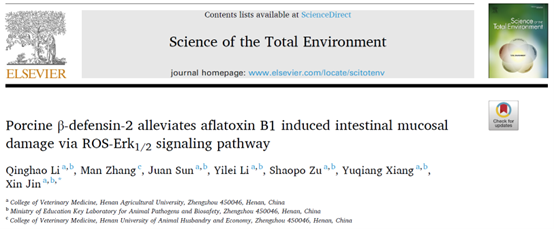 动物分子病原学团队在环境科学与生态学1区TOP期刊《Science of the Total Environment》(IF=9.8)上在线发表了“Porcine β-defensin-2 alleviates aflatoxin B1 induced intestinal mucosal damage via ROS-Erk
