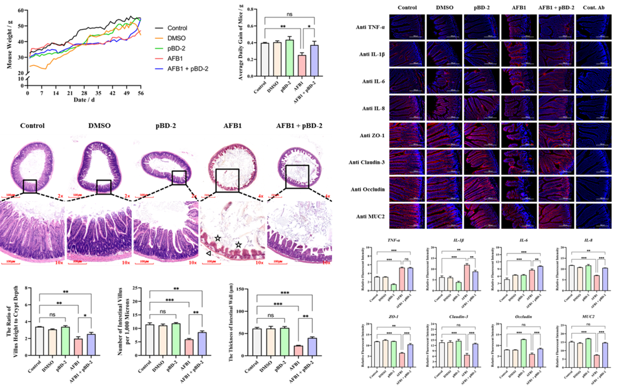 在体内试验中,以KM小鼠作为模型,通过灌胃方式,使用AFB1或pBD-2处理小鼠,记录不同处理组小鼠的体重变化情况并计算平均日增重(ADG),通过组织病理学分析小鼠小肠病理变化情况,再通过免疫学组织化学(荧光染色)分析了小鼠小肠炎症反应和黏膜上皮屏障的变化。检测结果显示:AFB1显著降低了小鼠体重增长速度及ADG,造成了显著肠道损伤,诱导了肠道炎症并破坏了肠上皮屏障;与AFB1组相比,pBD-2显著提高了小鼠ADG,缓解了肠道炎症反应,修复了上皮屏障与肠道损伤(图4)。