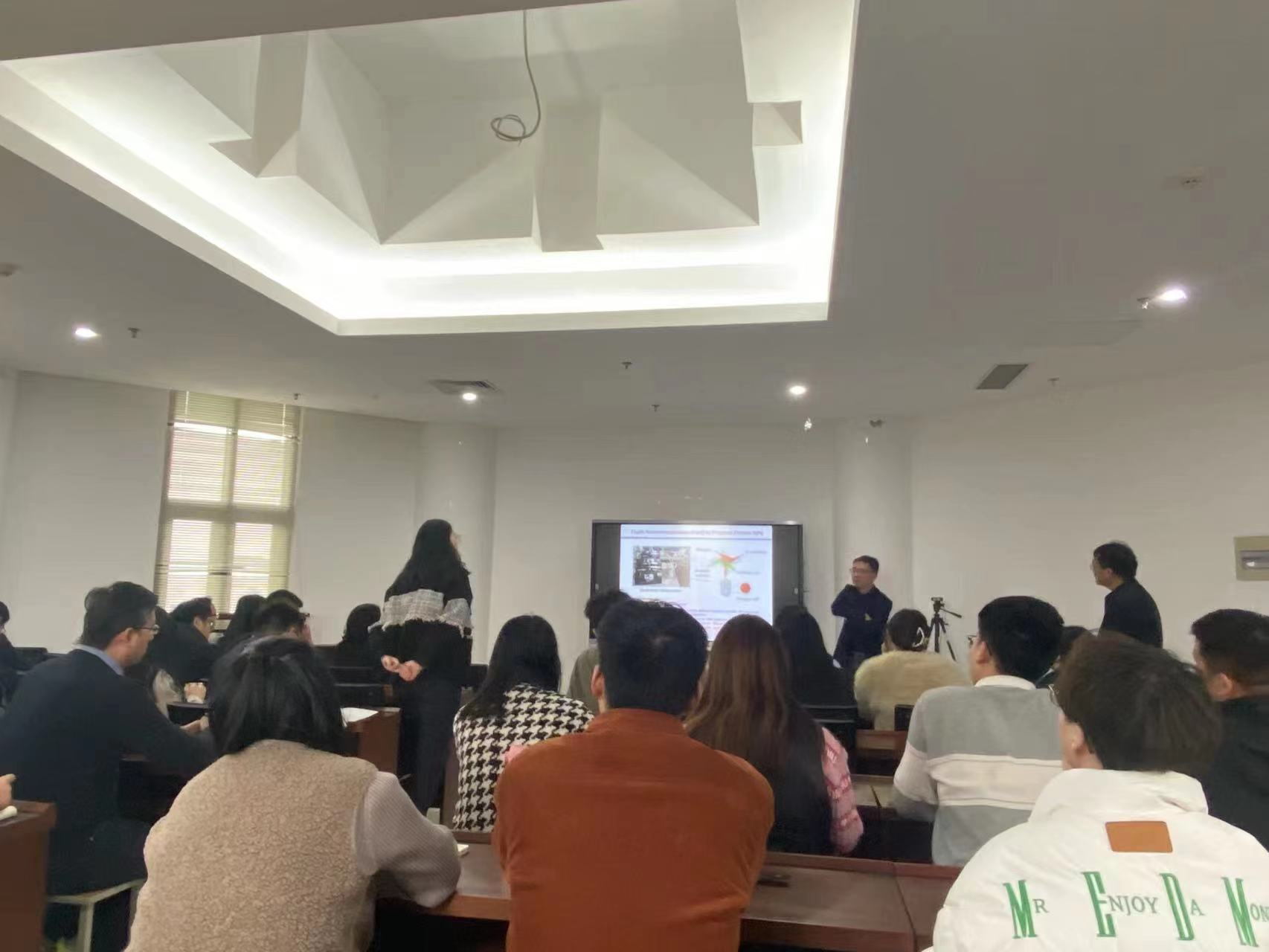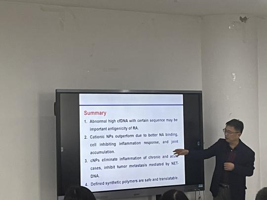 报告会上,陈永明教授首先指出了生物大分子药物和疫苗的递送在临床治疗中的重要性,重点介绍了新型纳米递送材料的研发与稳定制备新工艺、亚单位纳米疫苗对手足口病、慢性乙肝和新型冠状病毒肺炎的免疫保护机制、自限性免疫抑制疾病的治疗新策略等前沿性热点课题的最新成果,最后对纳米递送材料的应用前景与未来研发方向做出展望。与会师生对此次报告反响热烈,多名师生结合自身课题已取得进展和现存问题与陈永明教授进行了学术交流。