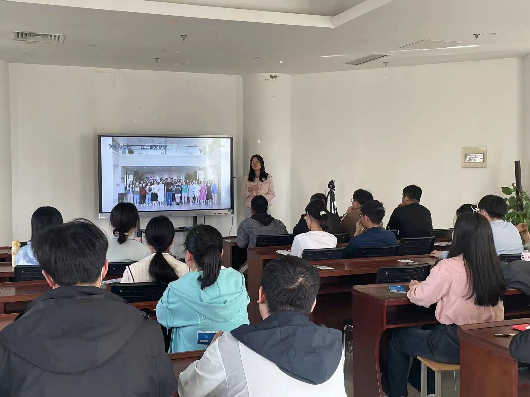 毕业校友邓梦梦参会,院团委辅导员以及部分2019级本科、研究生毕业生参加宣讲会。会议由冯杰主持。