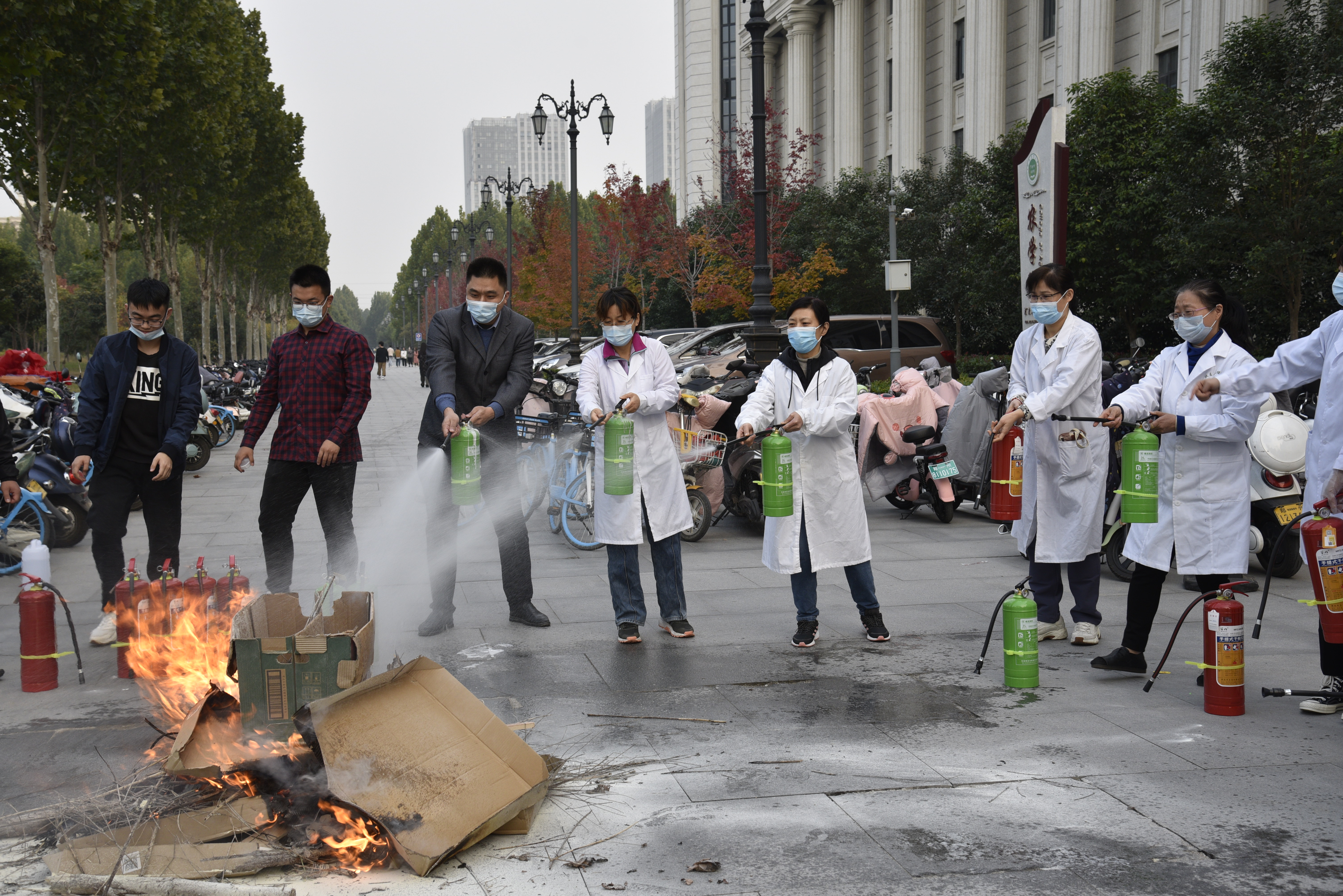 会后,韩立强带领实验中心老师在实验楼北面停车场进行了消防演习。每位实验老师均亲身体验了水基灭火器和干粉灭火器的使用方法和步骤。