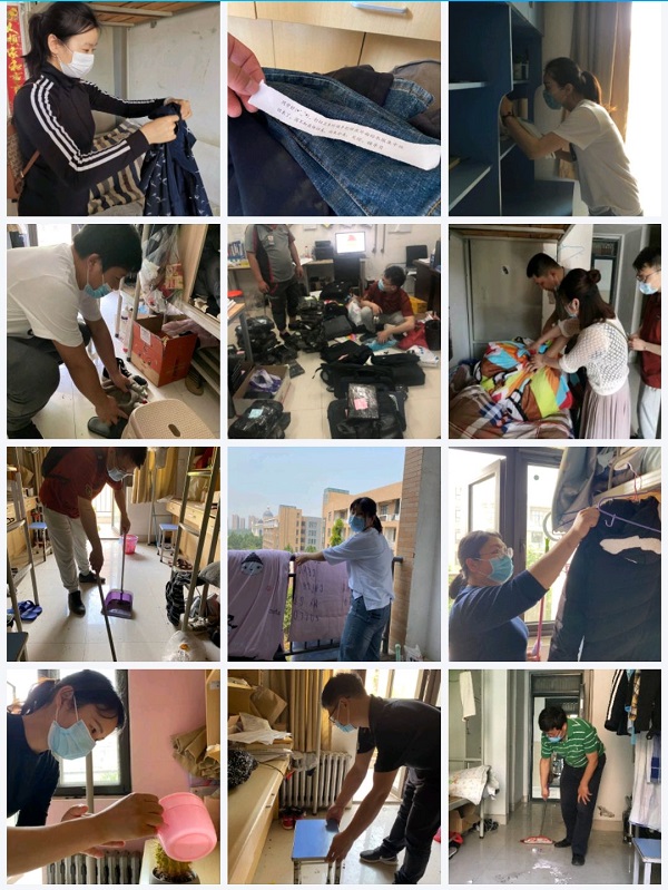 早上9点开始,9位小组成员商议后,分头负责不同楼域协助清洁人员共同打扫卫生,收回晾晒在阳台上的衣物,并贴心留下字条提醒;针对部分即将干枯的绿植,大家纷纷上阵,细心浇水;打扫卫生期间,辅导员们分头为100余位同学寻找指定物资、书本等,统一整理打包,稍后邮寄,针对部分同学物品位置不详的情况,辅导员们纷纷开启视频连线,实时互动,忙得不亦乐乎。
