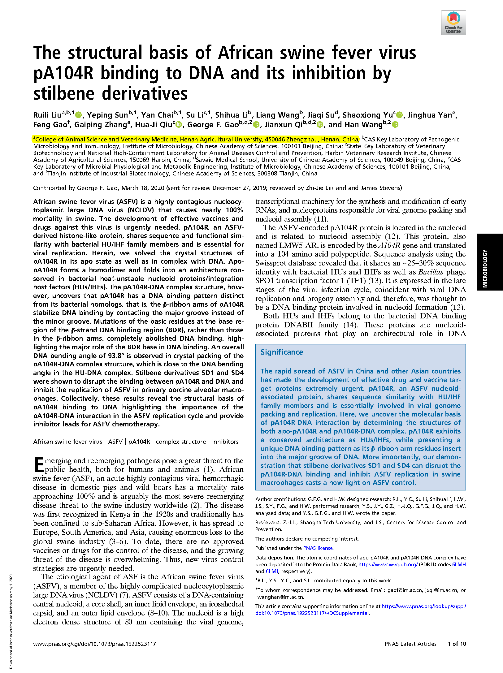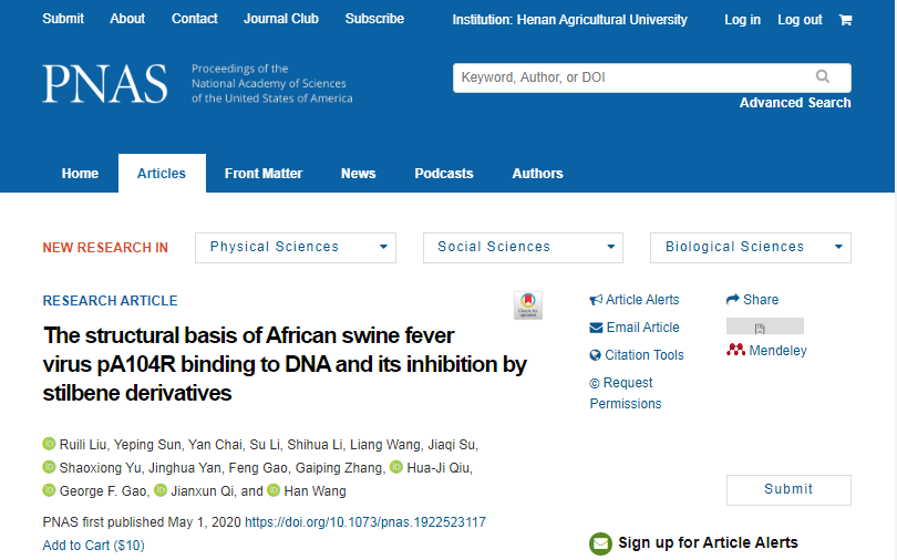 《The structural basis of African swine fever virus pA104R binding to DNA and its inhibition by stilbene derivatives》PNAS官方页面