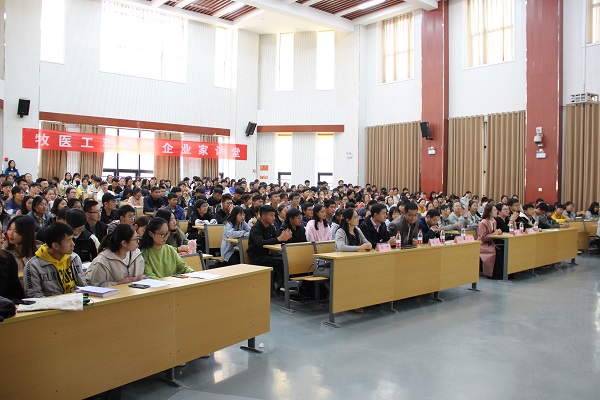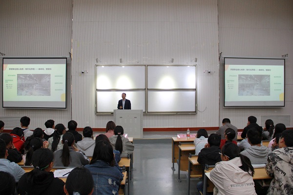 稍后,现场播放了新希望六和养殖宣传片,周端阳以《中国畜牧业发展趋势及人才成长路径》为题展开交流,他从国家经济发展现状、行业政策红利切入,引用新希望六和公司的成功案例,结合自身8年从“基层饲养员”跃升为“集团总裁”的经历,强调大学生一要在一行知一行、干一行爱一行,主动了解所处的行业大势,校准自身坐标;二要抓住一切机会汲取知识养分,主动提高自身的专业素养,丰厚自身搏击长空的羽翼。交流中,他引经据典,幽默风趣,现场气氛热烈。