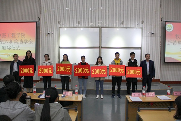 关于颁发“新希望六和奖助学金”的决定,周端阳、李明为受助学生颁奖并现场合影留念。