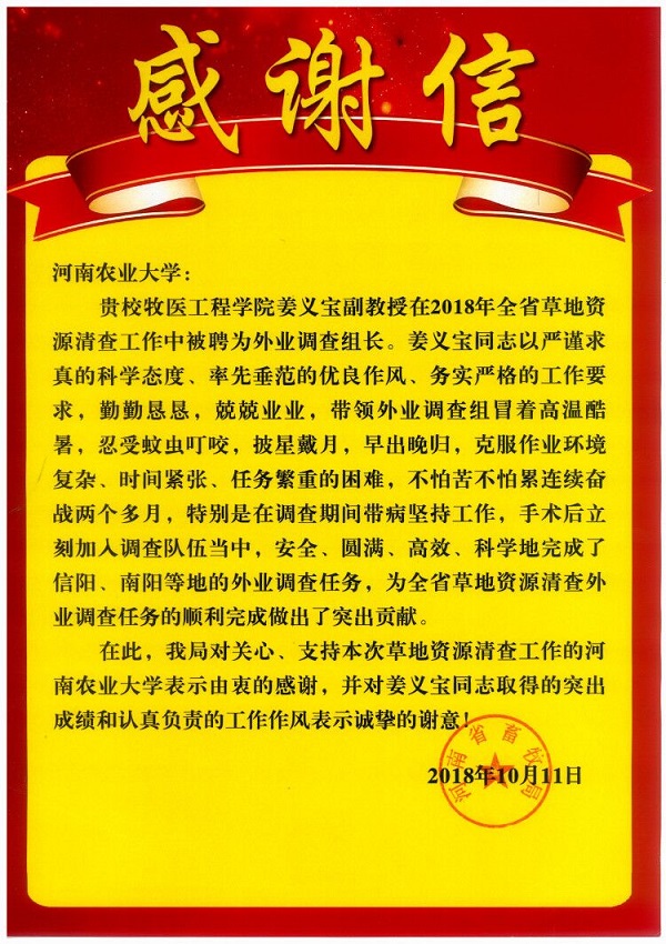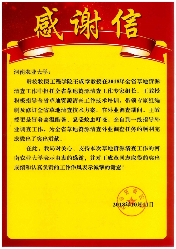 日前,百家乐补牌规则 收到来自河南省畜牧局的感谢信,对百家乐补牌规则 教师王成章、姜义宝在2018年全省草地资源清查工作中所做的出的贡献表示感谢,对他们严谨求真的科学态度、率先垂范的优良作风、务实严格的工作要求、吃苦耐劳的工作精神给予高度评价。他们的表现也展示了我们牧医人的风采。(文/韩笑)