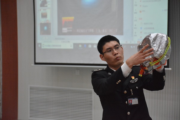 河南省消防协会、郑州市消防宣讲团的专职教员彭冲为学生讲解