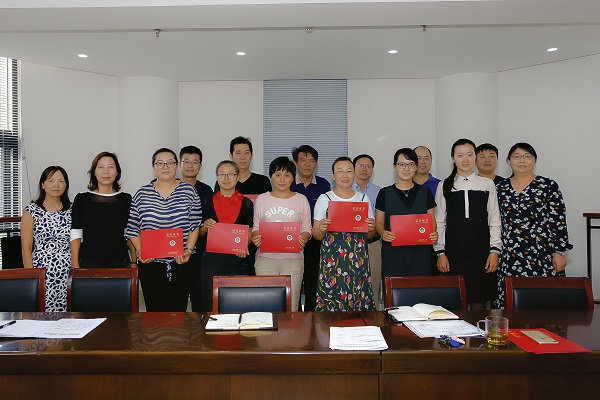 领导为获得表彰的教师颁发荣誉证书并合影留念。