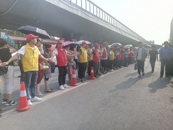 志愿者拉起人墙确保考生通过