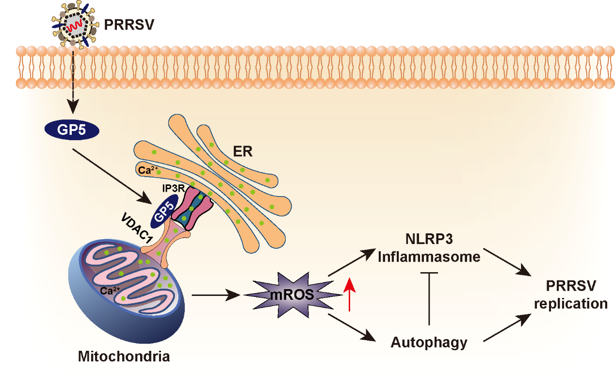 研究还发现GP5诱导的mROS还激活了NLRP3炎性小体。抑制自噬增强NLRP3炎性小体的激活并抑制PRRSV复制,提示自噬抵消了NLRP3介导的先天免疫应答。该研究揭示了细胞器在病毒‒宿主相互作用中的重要性,并为病毒复制与先天免疫反应之间的复杂相互作用提供了一定的理论基础。