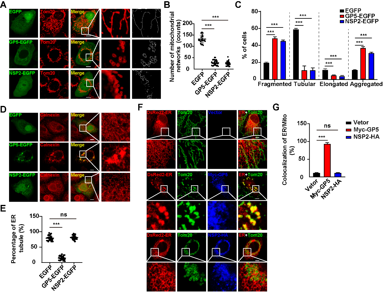 病毒已经进化出复杂的机制来操控宿主细胞器,使其成为病毒持续增殖的细胞内生存环境。该研究发现在PRRSV感染期间线粒体和内质网的形态都发生了显著改变,并且这两种细胞器的接触增强。过表达PRRSV编码的开放阅读框,确定只有PRRSV糖蛋白5(GP5)对内质网-线粒体接触是必不可少的(图1)。